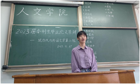 (通讯员 王康悦、谢垚桥)时光飞逝,弹指间,一年一度的本科毕业生论文答辩又如火如荼拉开了帷幕。2023年5月27日上午8时,现当代与外国文学2023届本科毕业生论文答辩于东校区13-B-510、511分两组进行。本次答辩由管兴平老师、秦鹏举老师分别担任答辩小组组长,朱道卫老师、吴新平老师、邓丽华老师、吴薇老师、周霜老师担任评委,秘书由邓丽华老师和周霜老师担任。谢垚桥等46名本科毕业生参加了此次答辩会。