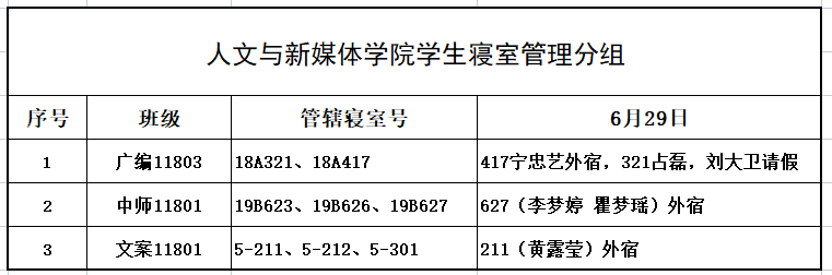 6月29日,我院组织学生干部对18、19级的宿舍进行每日寝室安全检查,现将查寝结果公布如下: