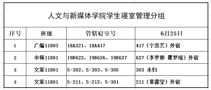 6月25日,我院组织学生干部对18、19级的宿舍进行每日寝室安全检查,现将查寝结果公布如下: