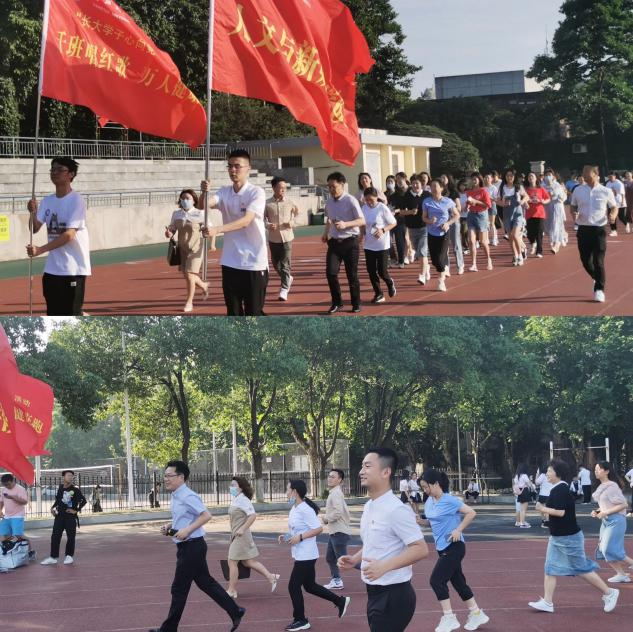 (通讯员 李冬芹 李悦)庆建党百年,树优良学风。6月7日早上,人文与新媒体学院东校区田径场举行“千班唱红歌,万人健康跑”活动暨升旗仪式。人文学院院长何世龙,学生工作办公室何宁老师,2018级和2019级本科生参加了活动。