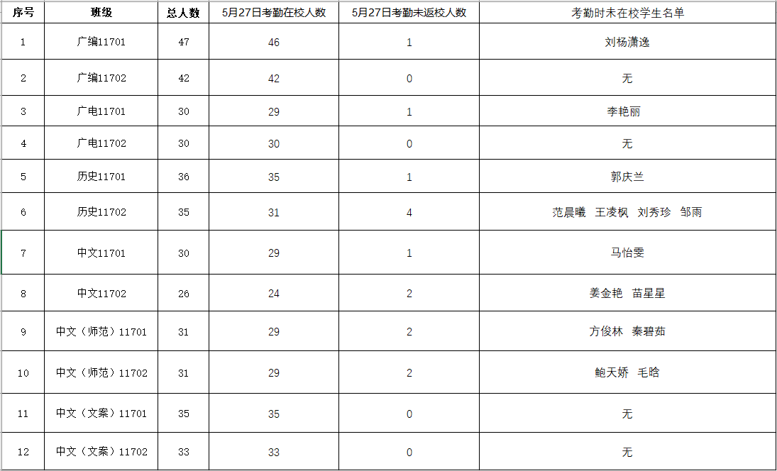 根据《关于加强毕业生毕业期间教育管理工作的通知》精神,现对5月27日2017级毕业生毕业期间在校考勤具体情况通报如下: