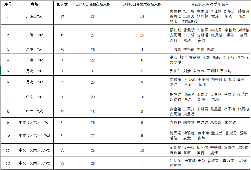 根据《关于加强毕业生毕业期间教育管理工作的通知》精神,现对5月16日2017级毕业生毕业期间在校考勤具体情况通报如下: