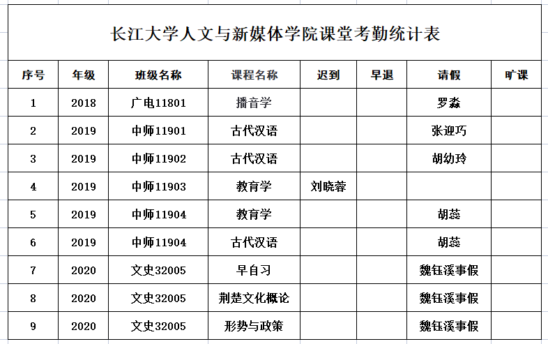 5月13日,我院组织学生干部对18、19、20级30个班的25门课程进行57次课堂考勤,100%到课率48次,现将考勤结果公布如下:
