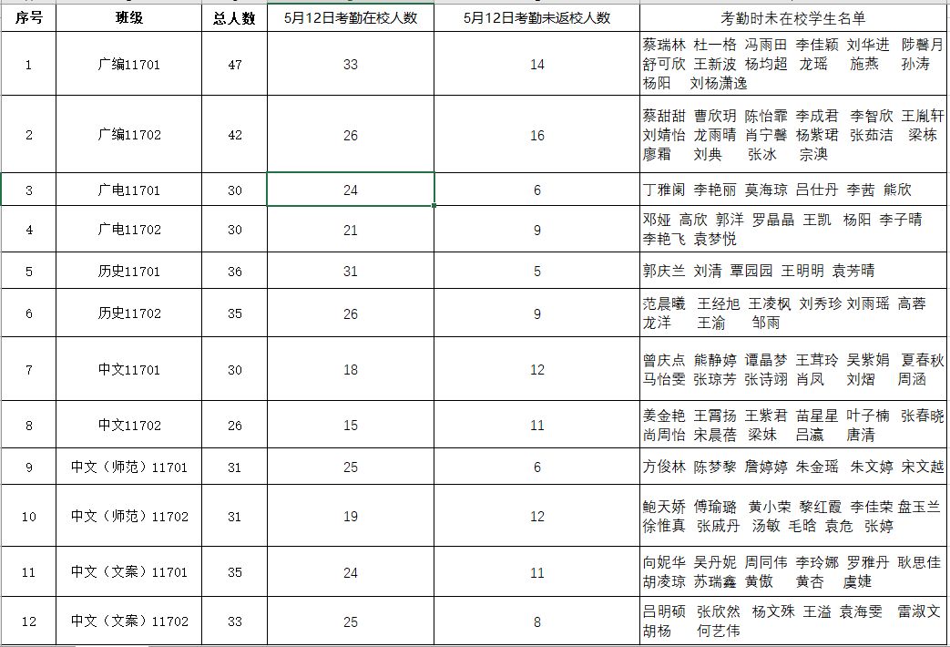 根据《关于加强毕业生毕业期间教育管理工作的通知》精神,现对5月12日2017级毕业生毕业期间在校考勤具体情况通报如下: