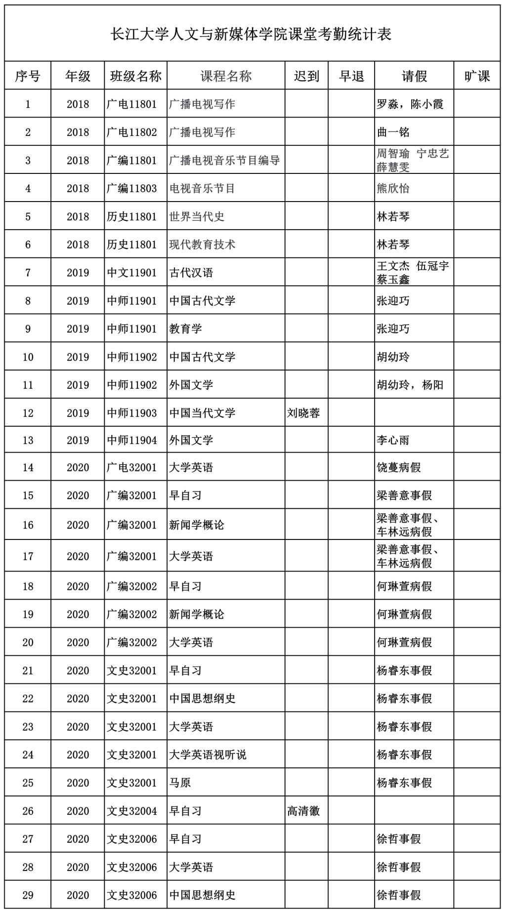 5月8日,我院组织学生干部对18、19、20级30个班的30门课程进行66次课堂考勤,100%到课率37次,现将考勤结果公布如下: