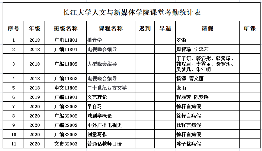 4月27日,我院组织学生干部对18、19、20级30个班的33门课程进行69次课堂考勤,100%到课率58次,现将考勤结果公布如下: