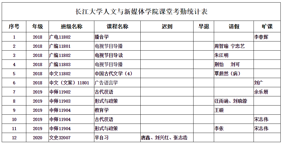 4月15日,我院组织学生干部对18、19、20级30个班的26门课程进行了54次课堂考勤,100%到课率42次,现将考勤结果公布如下: