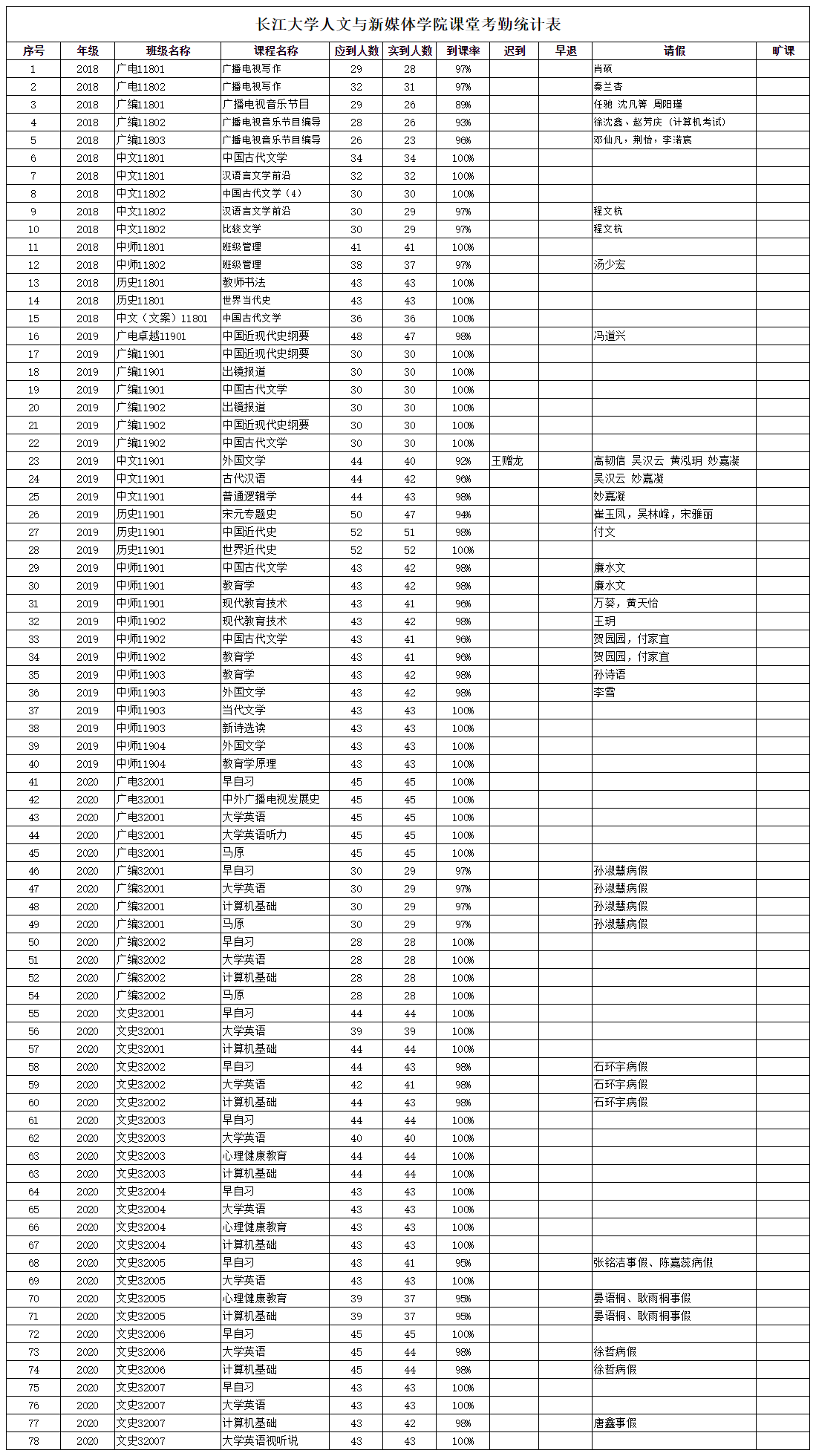 3月29日,我院组织学生干部对18、19、20级30个班的31门课程进行了78次课堂考勤,100%到课率43次,现将考勤结果公布如下: