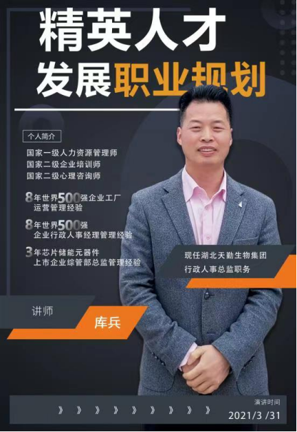 库兵,国家一级人力资源管理师,国家二级企业培训师,国家二级心理咨询师。拥有8年世界500强企业工厂运营管理经验,8年世界500强企业行政人事经理管理经验,3年芯片储能元器件上市企业综管部总监管理经验,现任湖北天勤生物集团行政人事总监。