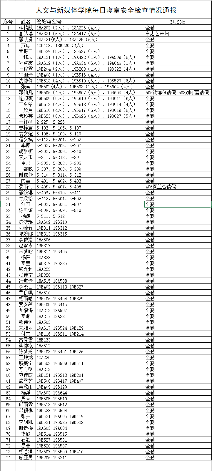 3月28日,我院组织学生干部对18、19级的宿舍进行每日寝室安全检查,现将考勤结果公布如下: