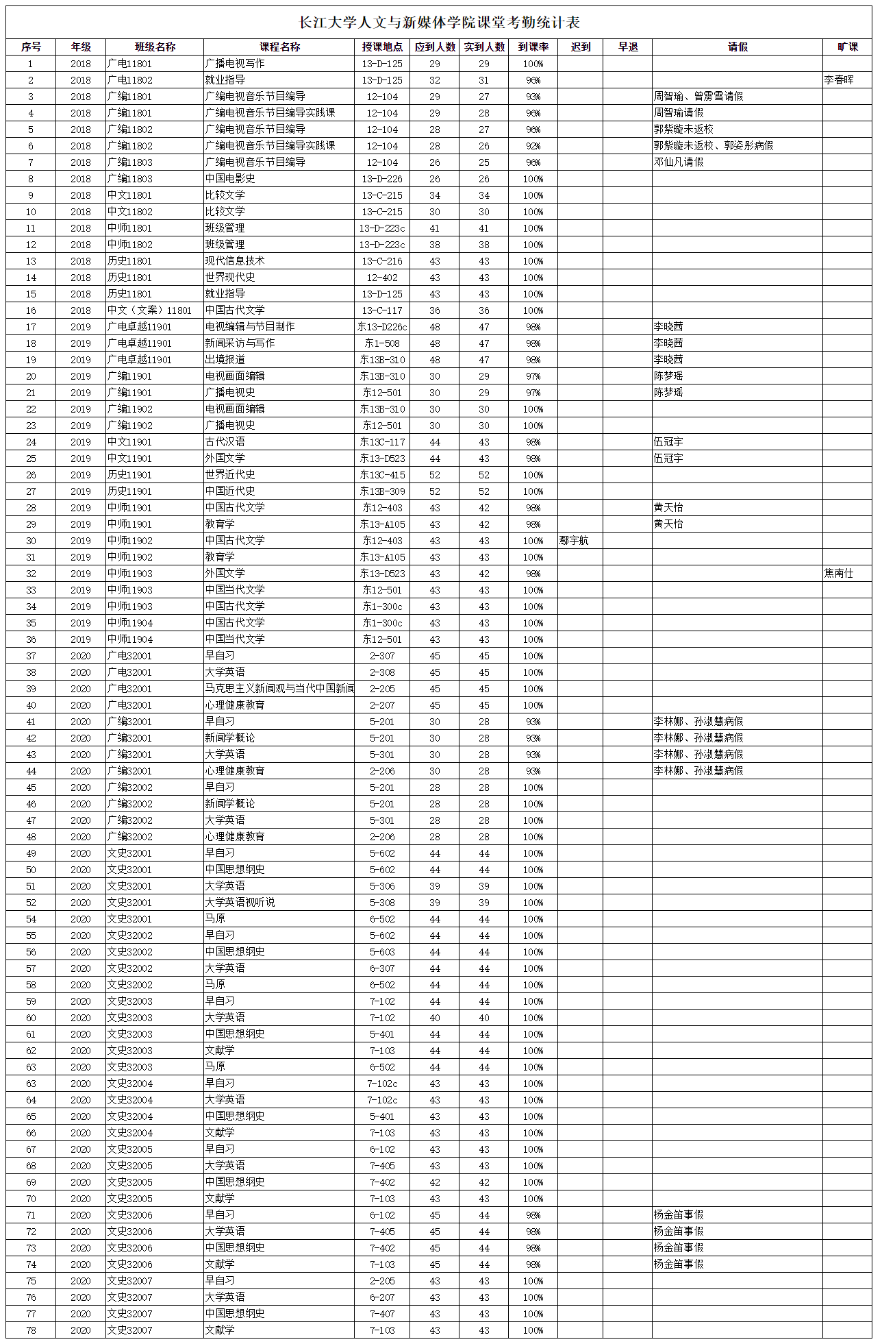 3月24日,我院组织学生干部对18、19、20级30个班的30门课程进行了78次课堂考勤,100%到课率54次,现将考勤结果公布如下:
