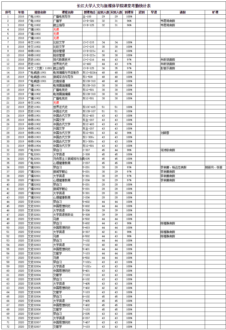 3月17日,我院组织学生干部对18、19、20级30个班的26门课程进行了72次课堂考勤,100%到课率55次,现将考勤结果公布如下: