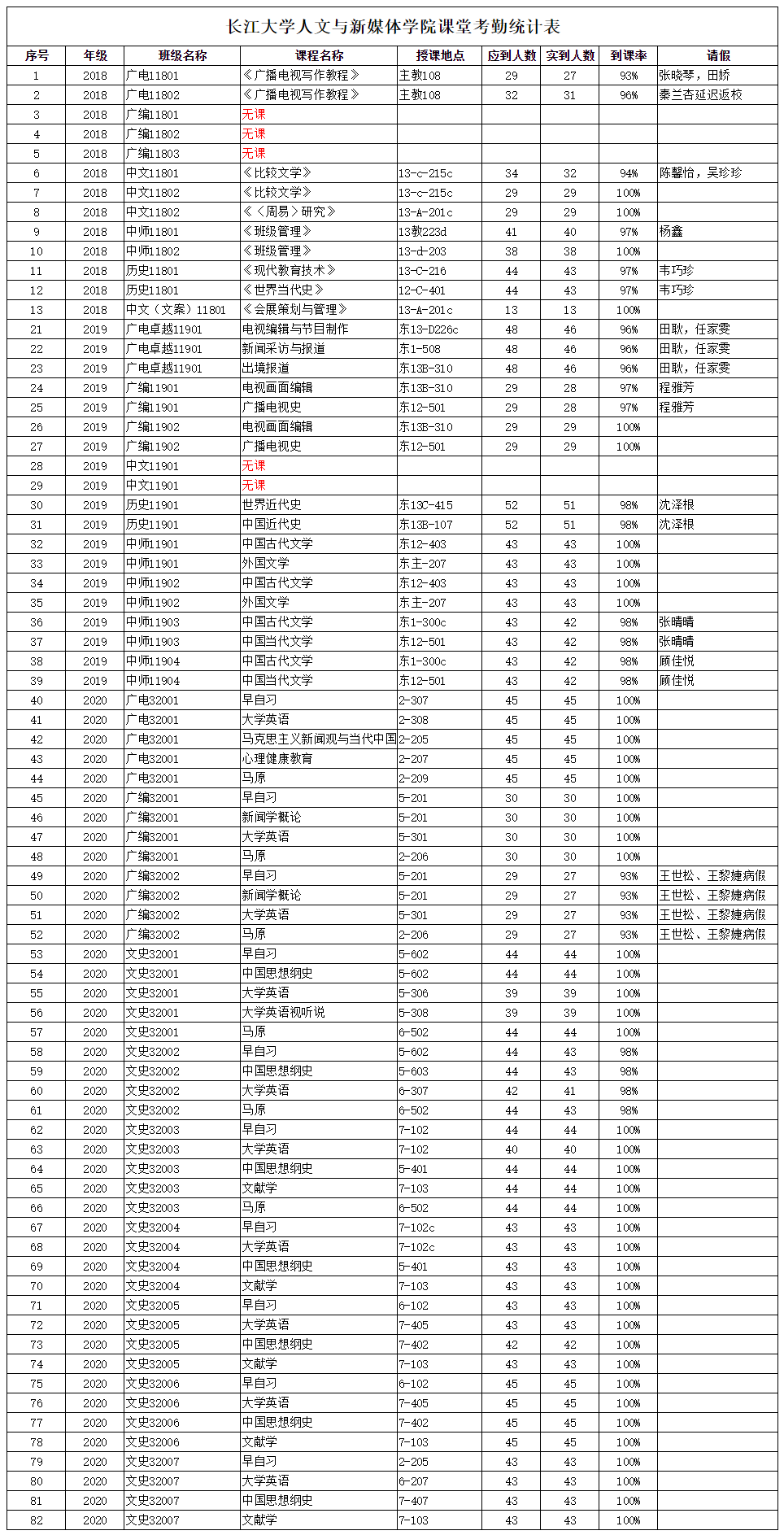 3月3日,我院组织学生干部对18、19、20级30个班的26门课程进行了77次课堂考勤,100%到课率45次,现将考勤结果公布如下: