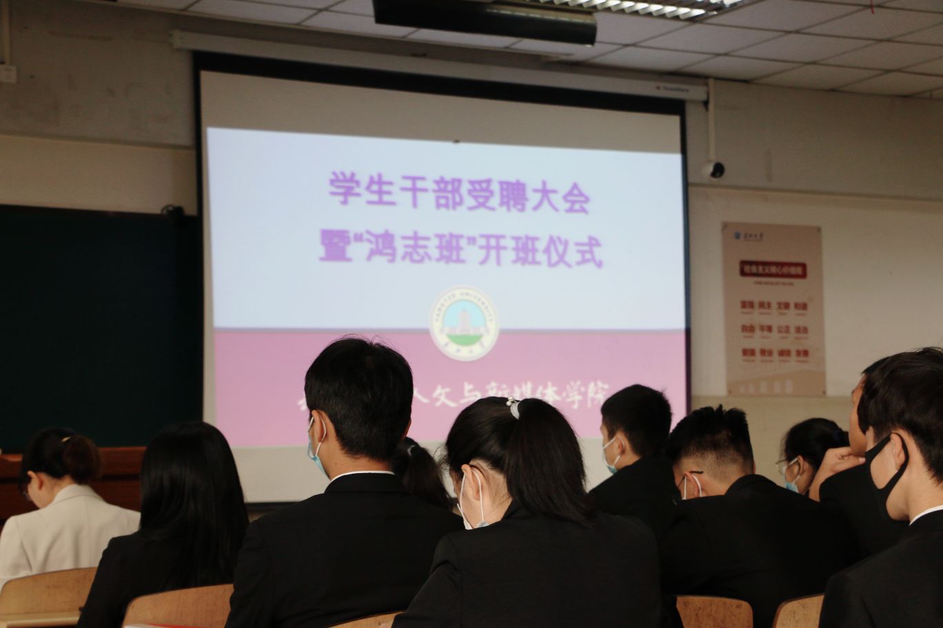 大会在庄严肃穆的国歌声中拉开帷幕。首先,严老师宣读了“鸿志”班成员名单。并由杨克非老师、胡世先老师分别为学生干部代表颁发聘书。