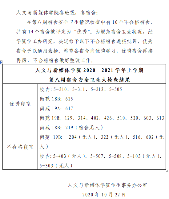 伟德国际victor·1946源自2020—2021学年上学期第八周宿舍安全卫生检查情况通报