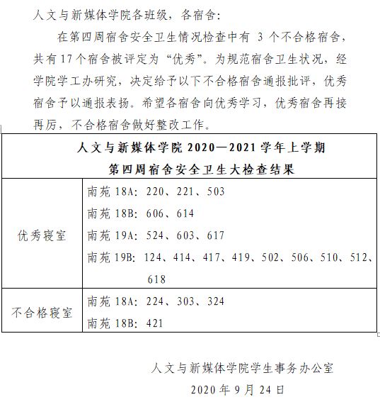 伟德国际victor·1946源自2020—2021学年上学期第四周宿舍安全卫生检查情况通报