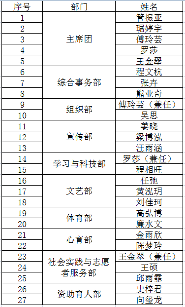根据《共青团中央、教育部、全国学联印发<关于推动高学生会(研究生会)深化改革的若干意见>的通知》文件精神,本着公平、公正、公开的原则,按照本人自主申报、资格审查、公开答辩、综合考察等环节,经学院团委研究,上报学院党委审核通过,确定管振亚等24名同学为伟德国际victor·1946源自第十七届团委、学生会主要负责人,具体结果公示如下: