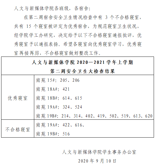伟德国际victor·1946源自2020—2021学年上学期第二周宿舍安全卫生检查情况通报