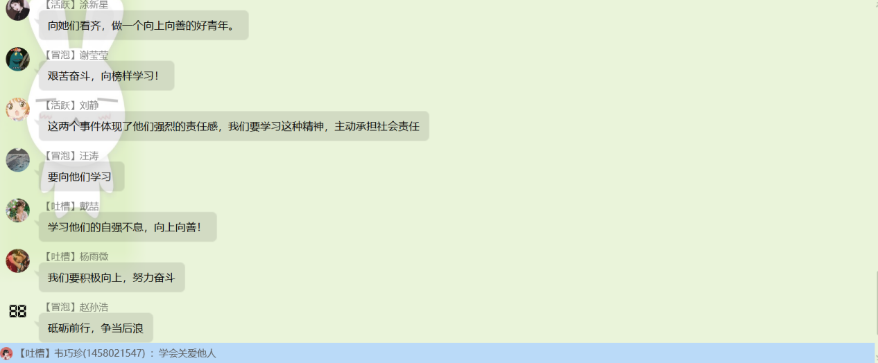 同学们通过此次班会收获颇深,在讨论环节积极参与讨论,在群内发表自己的观点看法。