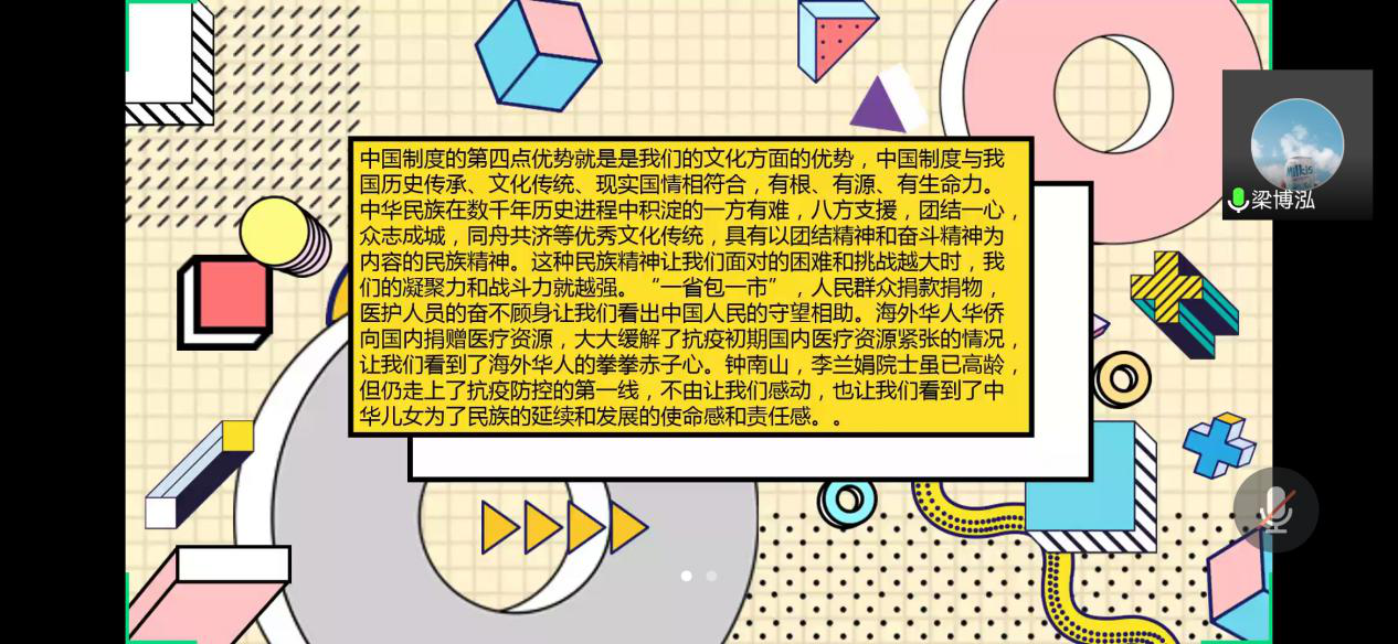 参与会议的伍世英老师也积极引导同学们在理论学习与实践活动中去体悟“集体共克艰难险阻”的意义,始终以一份深厚的民族情为我们的防范疫情成就喝彩,要积极听从国家的安排指挥,做好自身的防疫工作,理解支持各地防疫工作人员的工作安排。