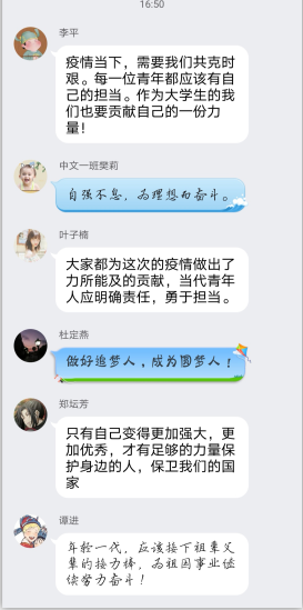 之后,又向同学们展示了习近平总书记给北京大学援鄂医疗队全体“90后”党员的回信。对信中习近平总书记的谆谆教诲同学们都给予了热情的回应。随后对《后浪》视频的观看,更是激励起了同学们心中的美好理想,郑坛芳、赵德强等同学纷纷在班群中交流了自己对“青年担当”“五四精神”的理解,表示作为新一代的青年,我们将会明确自己的责任,努力学习,从祖辈父辈手中接下接力棒,为民族的复兴继续努力奋斗!