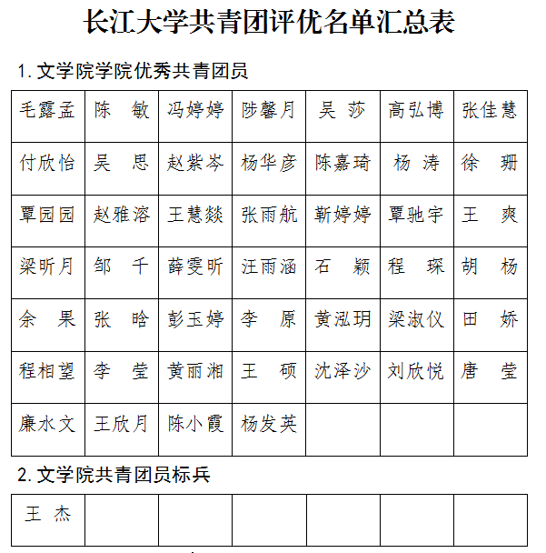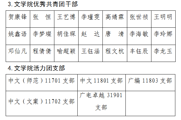 经个人申请、各支部推选、学院团委审核,拟推选毛露孟等46名同学评为“优秀共青团员”,王杰评为“共青团员标兵”,贺康锋等21名同学评为“优秀共青团干部”,中文(师范)11701支部、中文11801支部、广编11803支部、中文(文案)11702支部、广电卓越31901支部评为“活力团支部”,现予以公示。