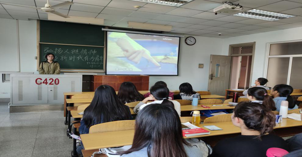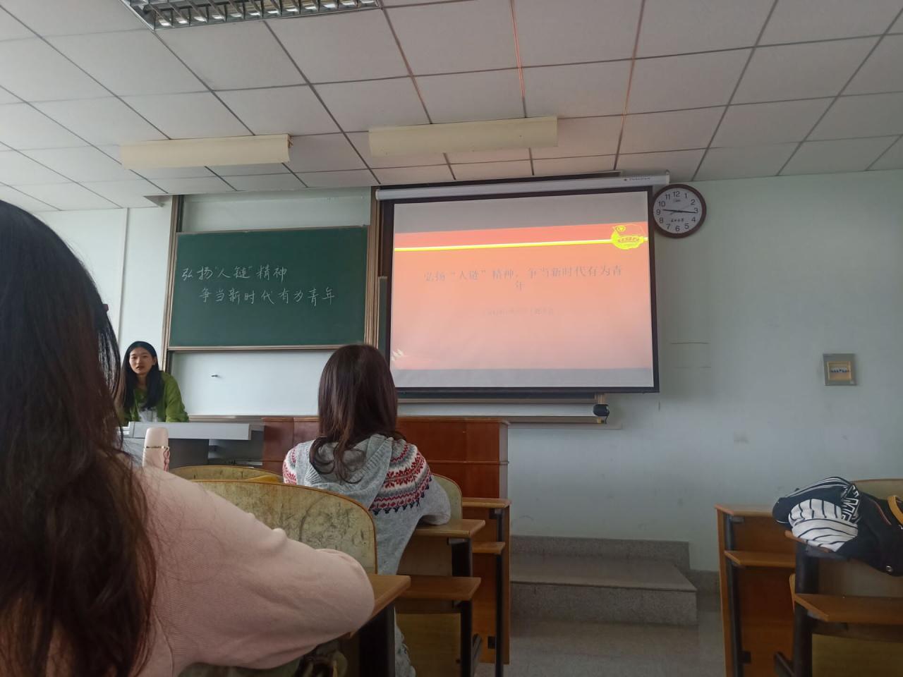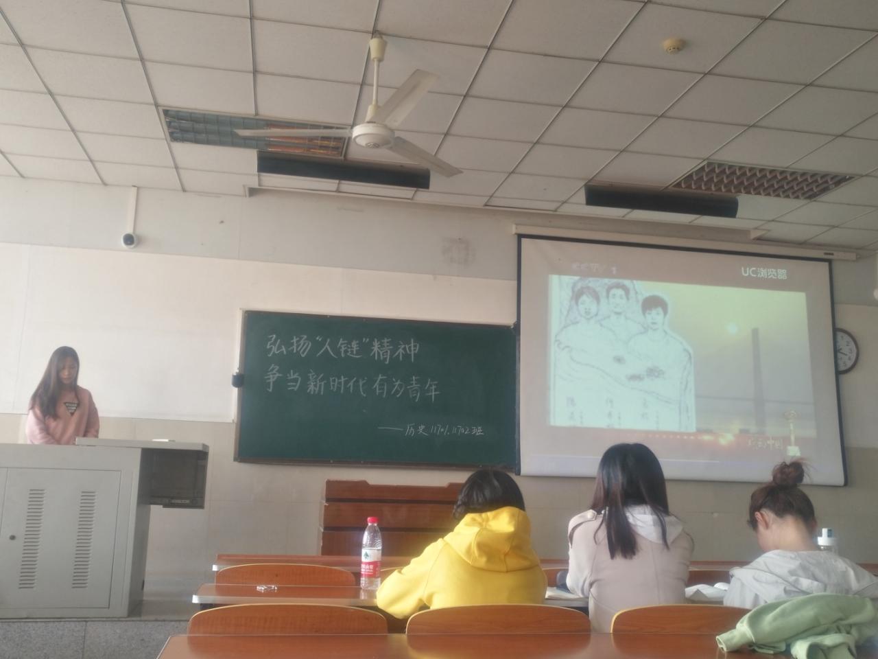 首先,由主持人播放ppt讲述大学生手拉手组成“人链”救人事件和“人链”精神及其带给我们的思考,让同学们详细了解“人链”精神并对“弘扬‘人链’精神,争当新时代有为青年”这一主题有深入的了解;