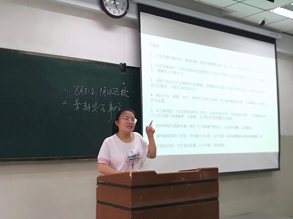 会上,陈娟老师首先向所有暑期留校学生传达了学校关于暑期学生留校的相关注意事项。并从“吃”、“住”、“行”、“盗”、“火”、“水”、“毒”、“艾”、“恐”、“坛”、“心”、“网”等十二个方面着重强调了安全问题,提醒同学们注意人身、财产安全及身心健康。留校学生要严格遵守宿舍有关管理规定,要按照作息时间归寝;严禁在寝室内使用违规电器,离开寝室时要关好门窗;严禁到江、河、湖、渠等无救生设施的水域游泳、戏水;有事情要及时与辅导员老师联系。她强调,安全问题要牢记心间,无论是在校复习还是外出实习,安全第一。接着,她为现场同学带来考研提醒,鼓励在场同学要对自己有信心,并且要合理利用暑假进行备考。最后,她不忘提醒同学随时注意自身心理情绪的变化,有问题及时向老师寻求帮助,并代表学工处老师提前祝大家假期愉快。