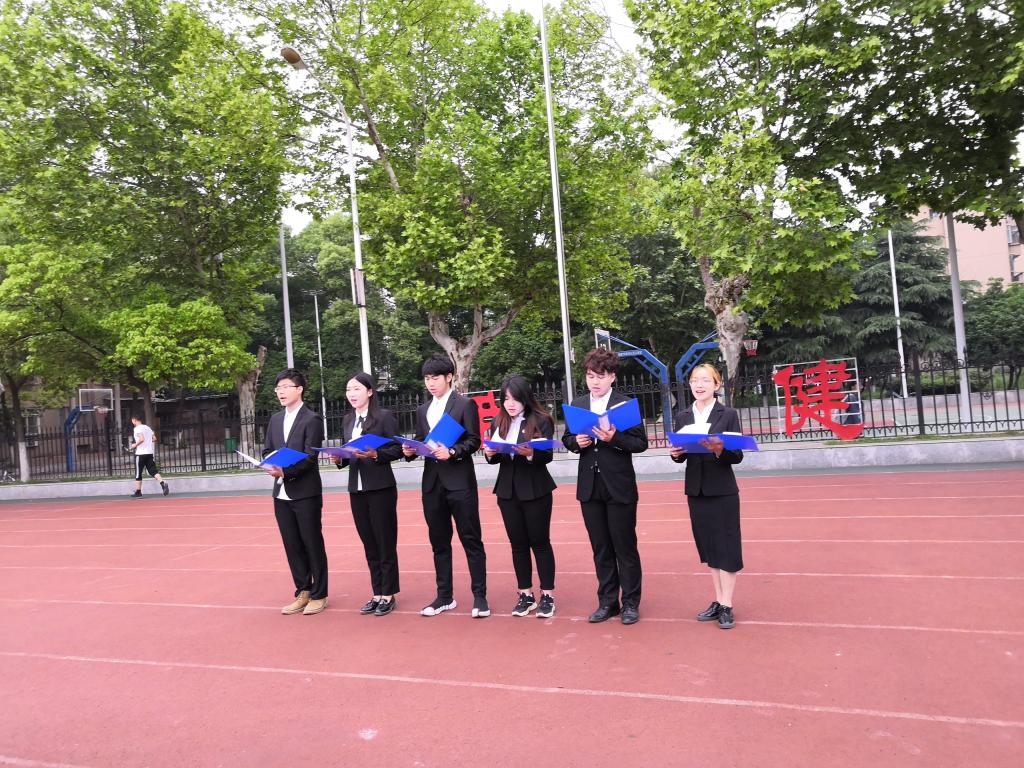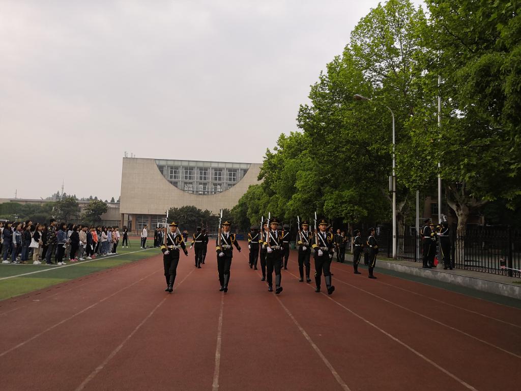 第一项,奏国歌,升国旗。伴随着行进的号令,我校国旗护卫队的护旗手们簇拥着国旗,迈着整齐的步伐向升旗台走去。在庄严的中华人民共和国国歌声中,文学院全体师生目视着护旗手们将国旗高高升起,爱国之心油然而起。