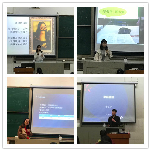 之后,由今年考取武汉大学文学院文艺学专业的徐郁明分享她的考研的计划和方向;由考取湖南师范大学文学院比较文学与世界文学的宋艳传授了考研的学习细节经验和学习步骤;由考取西南大学比较文学与世界文学的陈紫薇讲述了她考研期间的学习故事和心态的变化。三位15级同学从不同的角度,不同的学习体会中让18级同学感受到了她们考研的辛苦和个人奋斗努力后的成就感,更加深刻地明白了考研绝非易事但付出终有回报。
