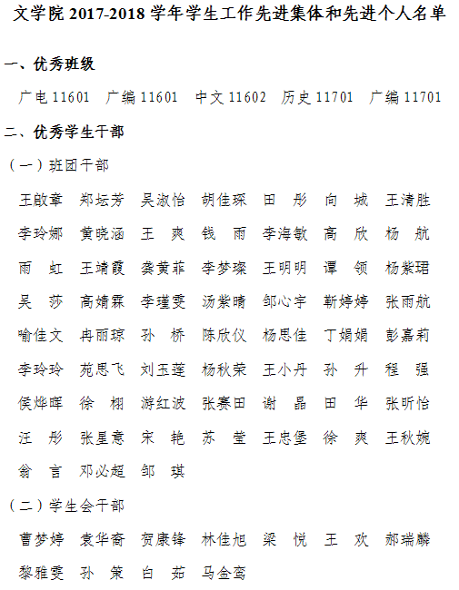 关于文学院2017-2018学年学生工作先进集体和先进个人名单的公示