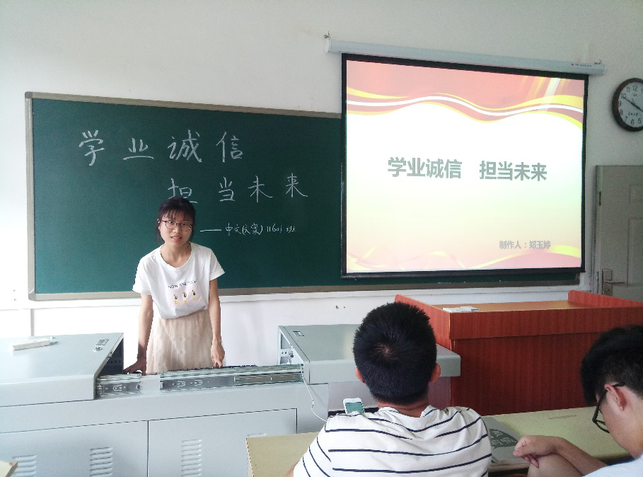 2018年5月14日下午4:00许,中文文案11601班开展了以“诚信学业,担当未来”为主题的班会,中文文案11601的全体成员与会。