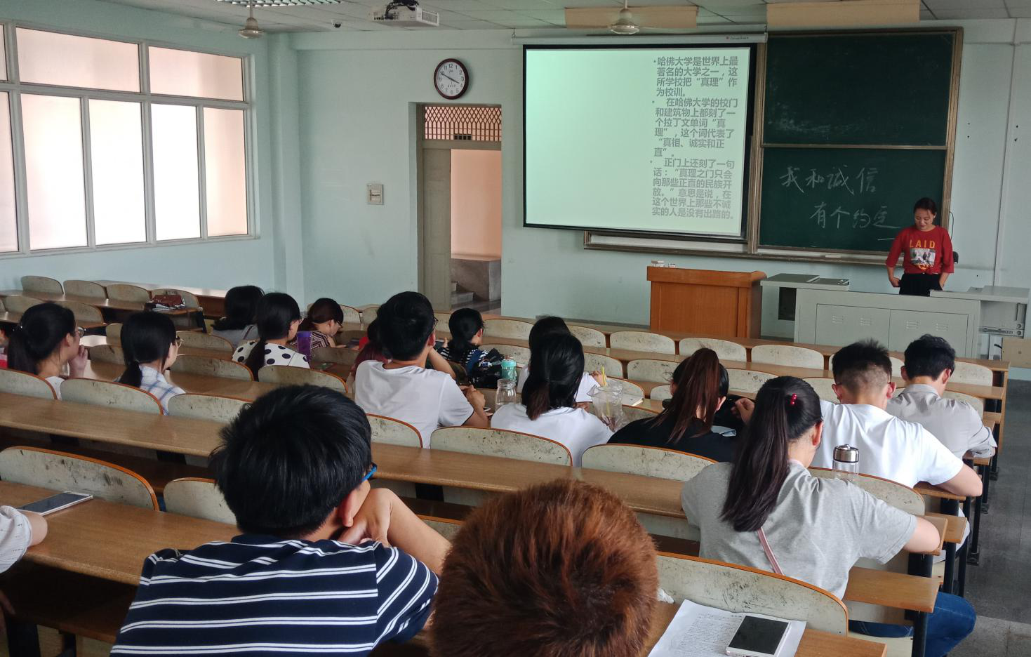 11601班于5月16日下午第二大节课在主教307教室召开“诚于心,诺于行”的诚信班会。班会上同学们认真聆听主持人和各位学生代表的发言。