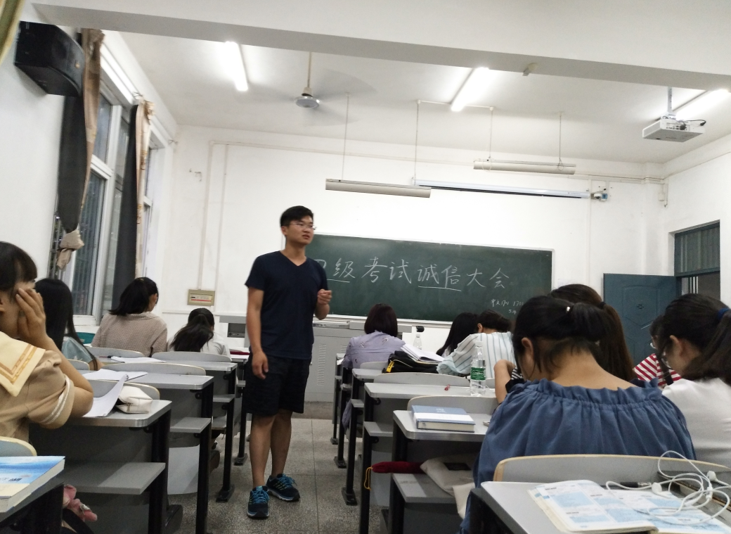 五月14日晚7点整,中文1701、1702开展了四级诚信考试宣誓大会。中文班的班主任龙厚雄老师,中文一班班长赵达两人以“诚信考试”为主题,为大家做了相关的介绍。 开始由赵达同学为大家做了一个简单的开场白,为大家讲了本周六的四级口语考试和六月四级考试的诚信问题。既在开始为大家动员,也强调考试的一个基本的诚信问题。