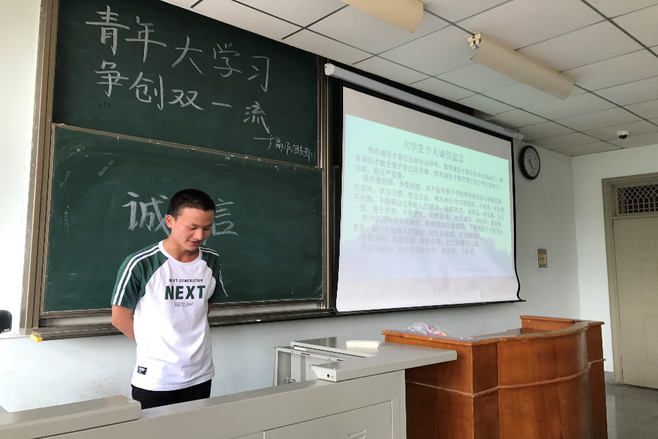 2018年5月14日星期一,17级广播电视学全体同学在西6教106c召开了“诚信考试”的宣誓大会,此次大会由广电11702班班长主持并主讲。