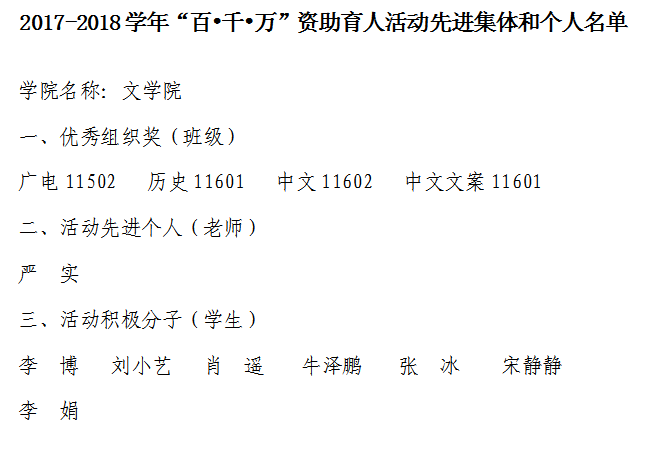 文学院2017-2018学年“百•千•万”资助育人活动先进集体和个人评选名单公示