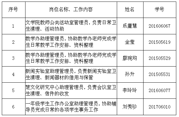 文学院2018年春季勤工俭学学生名单公示