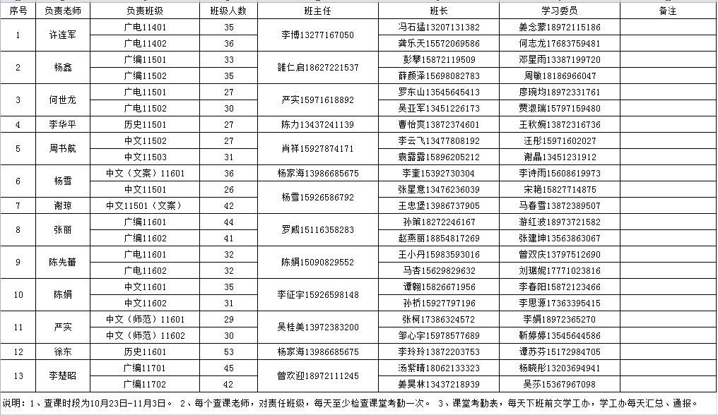 文学院“安全文明教育月”课堂检查分组安排