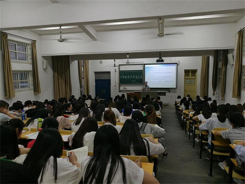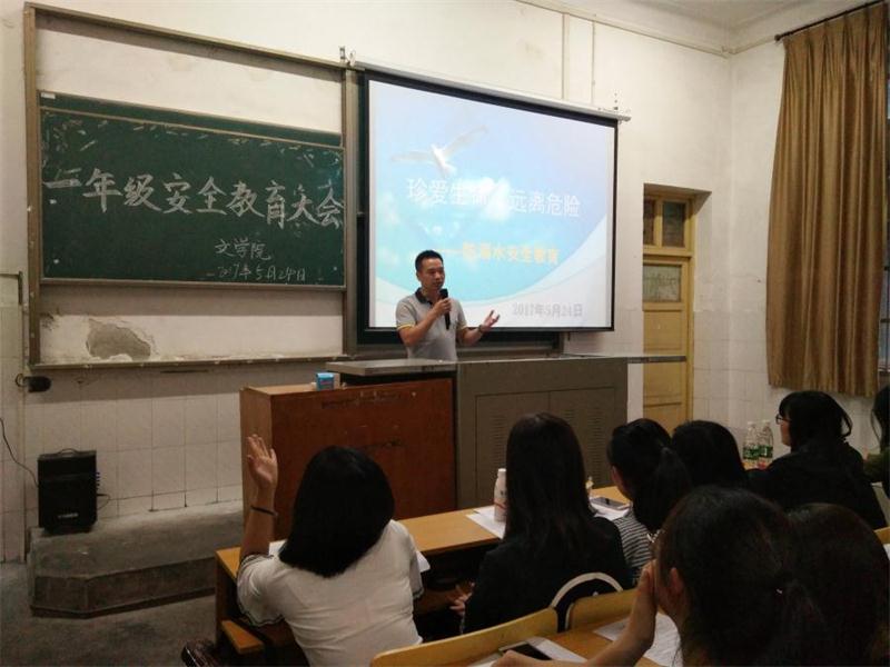 (通讯员 李伟涛)炎炎夏日已到来,游泳嬉戏需谨慎。为增强同学们的安全意识,减少危险事故的发生,以防溺水为主的安全教育大会于5月24日晚7:00在2教T1举行。学院党委副书记周书航主讲,辅导员陈娟和西校区全体文学院大一学生参加大会。
