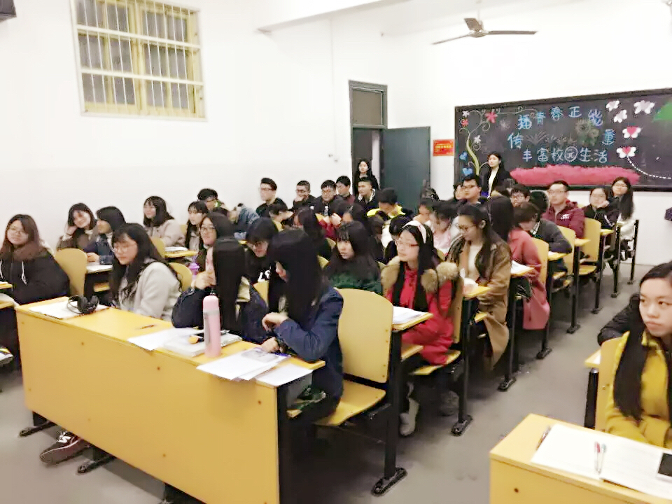申报“舞台明星”的广编11402班余木同学在给中文班的学生宣讲中,讲述了自己在长江话剧社三年的青春记忆,在这里他找到了自信并且成长。到兴起时,他还现场给大家演绎了一段自己在《张居正》里面的表演,精湛的演技赢得大家的阵阵掌声,最后他引用《大鱼海棠》里的“学会去爱一个人、攀一座山、找一个梦想 ”作结语,希望在场的学弟学妹们都能开心不留遗憾的过好大学生活。