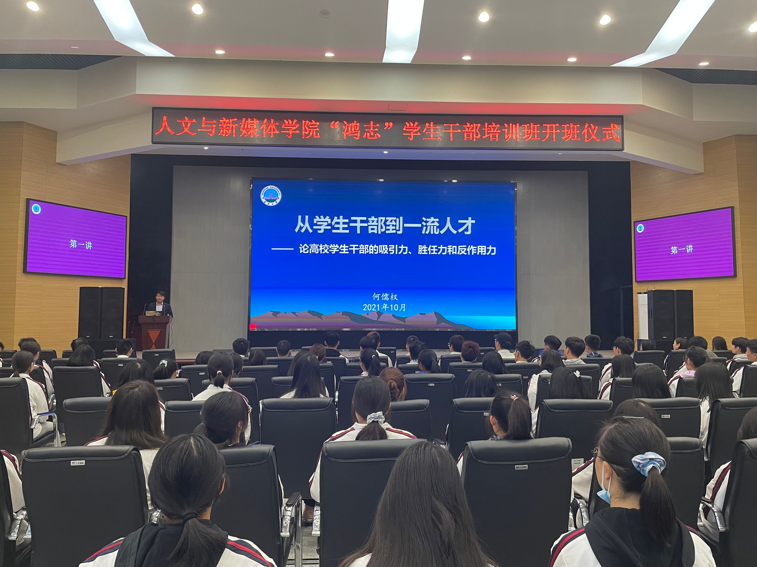 开班仪式后,鸿志班开启第一讲授课,由城市建设学院团委书记何儒权老师开讲。何老师以从学生干部到一流人才为题,精炼论述了高校学生干部的吸引力、胜任力和反作用力。建党百年,欣逢盛世。值此之际,学员们踏上征途,让我们期待他们能够一路前行,勤奋学习,以马克思主义思想为指导,不断提升自身素质,追逐理想,度过无悔的青春。