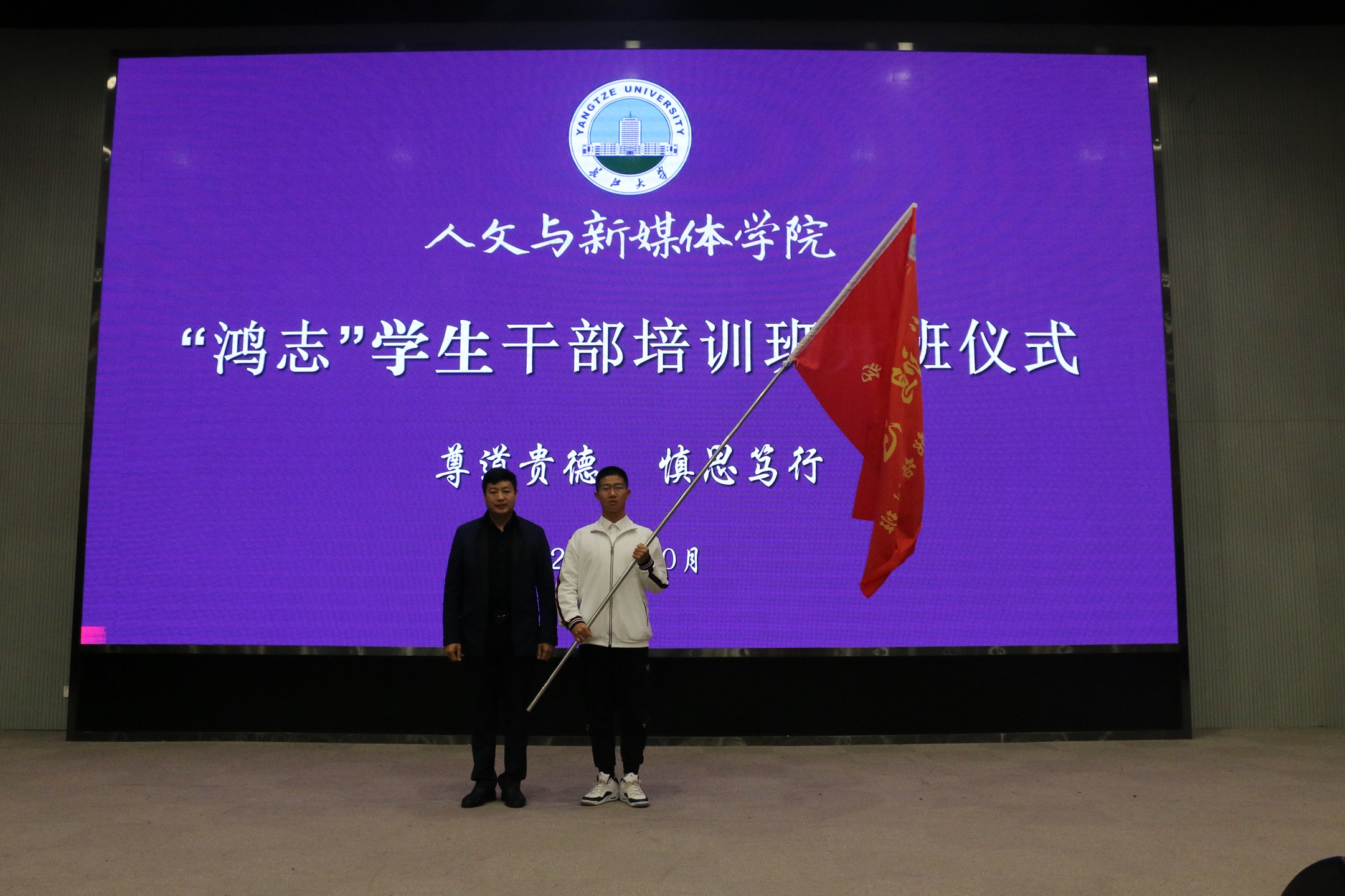 首先,大会开始,全体师生唱响了庄严的国歌,接着邹晨玉同学作为新学员代表发言,对于四年之后我们成为什么样的人的疑惑,邹晨玉同学给出了答案,那就是成为一名兼备知识素养和业务能力,且对社会有价值的人文学子。心有所信,方能行远,汪雨涵同学作为上一届优秀学员代表给我们分享了她在鸿志班一年的所学、所思、所获,希望大家坚定信念,不负韶华,成长为一名优秀的人文学子。随后学院党委副书记胡世先老师为鸿志班授旗并发表讲话,鸿志班为什么学、学什么、怎么学,胡老师分三个方面给我们指明了前进方向。他对学员寄予了成长为一名“怀鸿鹄之志、展人文之风”的优秀学生干部的殷切期望。然后全体学员在领誓人付锦的带领下进行了庄严宣誓,每个学员立志成为德才兼备的学生干部,闪耀出长大学子的璀璨之光。