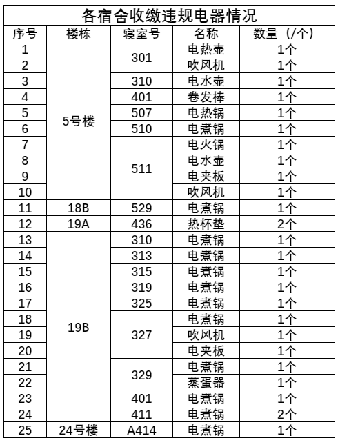 学校近期对全校宿舍的消防安全进行了隐患排查,对我院宿舍使用违规电器的情况通报如下: