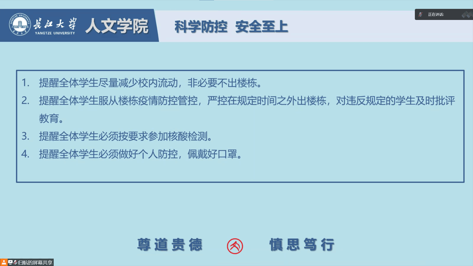 科学防控,安全至上。会议要求全院学生必须提高政治站位,增强防范能力,筑牢疫情防控屏障,为接下来学校线下教学工作打好坚实基础。