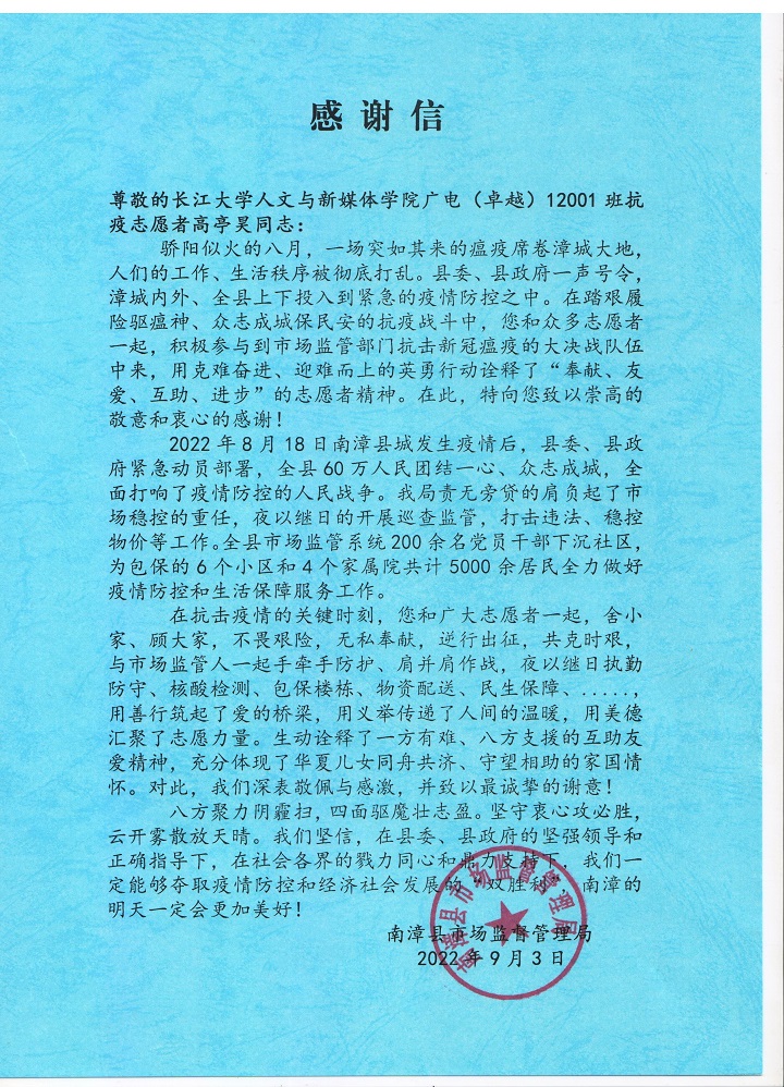 “在踏艰履险驱瘟神、众志成城保民安的抗疫战斗中,您和众多志愿者一起,积极参与到市场监管部门抗击新冠瘟疫的大决战队伍中来,用克难奋进、迎难而上的英勇行动诠释了‘奉献、友爱、互助、进步’的志愿者精神。在此,特向您致以崇高的敬意和衷心的感谢!”近日,我院收到了一封特别的来信——来自南漳县市场监督管理局的感谢信。