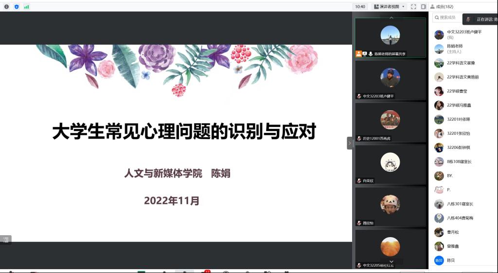 为提高学生干部对心理健康的认识,加强对心理问题的重视,11月17日,伟德国际victor·1946源自开展了2022年下半年新生心理骨干线上培训会。我院心理专干陈娟老师担任主讲人,2022级全体学生骨干参与此次培训。