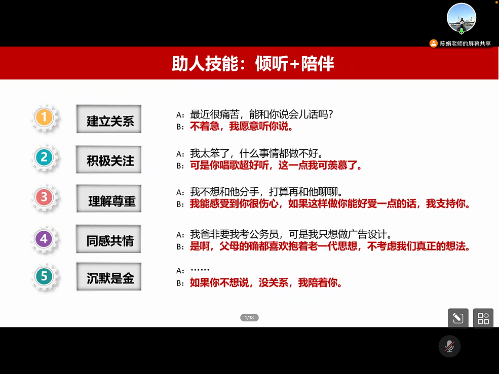 会议伊始,陈老师幽默提问:“今天,你网抑云了吗?”有趣地引出当今大学生被心理问题困扰已久的社会现象。随后,陈娟老师从认识心理健康、识别心理危机、正确应对心理危机以及我校心理健康教育体系四个方面,对大学生常见心理问题的识别与应对进行详细讲解。陈娟老师重点介绍了判断心理危机的三个标准,同时告诉学生干部们要注意身边同学的行为表现,要主动担任在危机干预中的职责,关心关爱身边的同学。“当他人出现心理危机时,我们应该给予尊重和陪伴,认真倾听,不着急给予建议,不做价值评判,认可对方的痛苦感受。”陈娟老师说道。