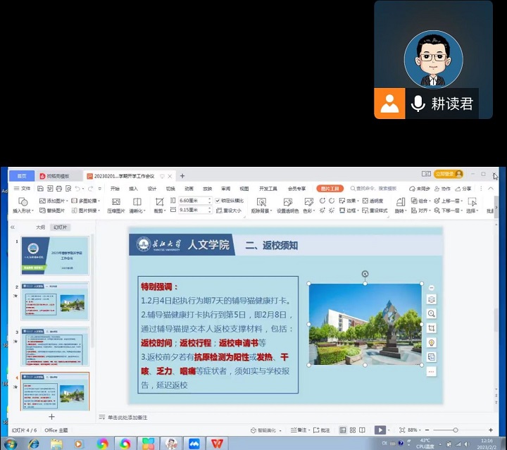 会上,各班级重点学习了国务院联防联控机制综合组2023年1月7日印发的《新型冠状病毒感染疫情防控操作指南》,强化学校疫情防控要求,提升学生健康安全责任意识。此外,各班主任向学生们讲解了返校报到的具体条件和流程,强调先申请后到校,非批准不返校,同时对返校后的开学补考纪律要求及学习生活也进行了提示。