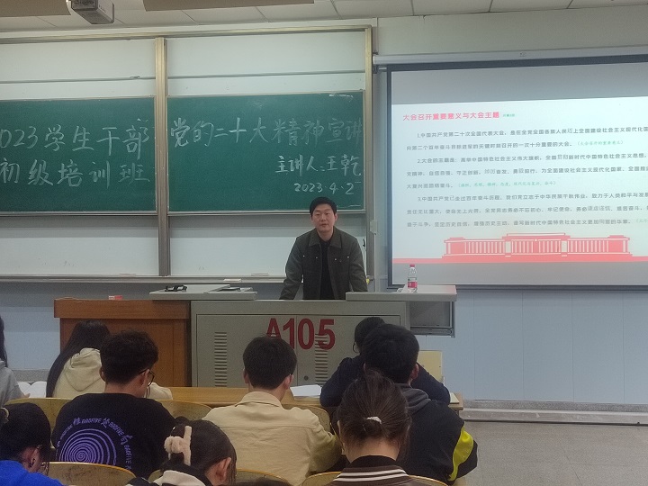 为深入学习贯彻党的二十大精神,提高学生干部的思想道德素质和服务师生能力,4月2日14时,学院第三期“鸿志”班在东校区13教A105开展二十大精神学习主题宣讲会。宣讲会邀请医学部团委王乾老师主讲,学院团委彭超老师主持。