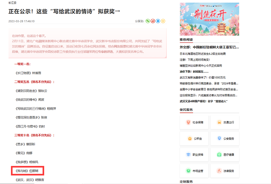 (通讯员 彭超 伍卿娴)近日,由湖北广电融媒体新闻中心联合湖北省中华诗词学会、武汉新华书店股份有限公司发起的写给武汉的情诗品牌活动获奖名单公布。我院中师12104班伍卿娴同学的作品《我与她》从七百余篇参赛作品中脱颖而出,获得三等奖。
